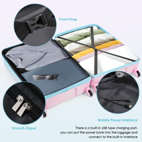 3-Piece Trolley Set, 20" with USB Port, Airline Certified Carry-On Luggage, ABS+PC Hard Shell Luggage with Spinner Wheels, Light Blue and Pink 4