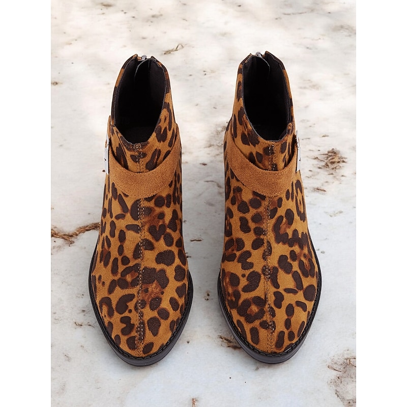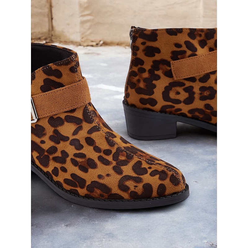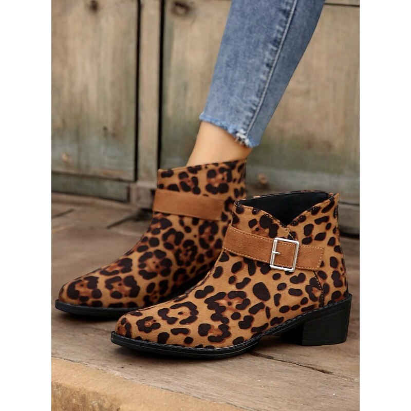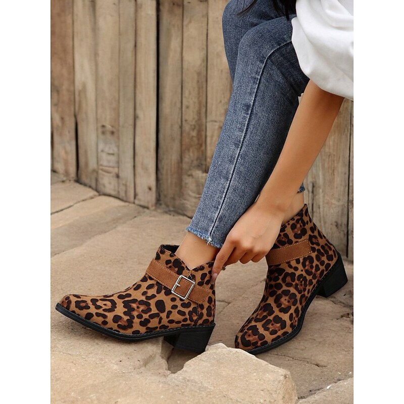 Highlights [Fabric and Material] These women's ankle boots are crafted from high-quality faux suede, delivering a soft, luxurious feel. The rubber outsole provides durability and grip, ensuring stability on various surfaces. [Style and Fit] With a sleek and contemporary silhouette, these booties effortlessly combine Western style with casual sophistication. The chunky low heel offers comfort and stability, making them ideal for all-day wear. [Design Highlights] Featuring a striking leopard print, these boots include an adjustable strap with a metal buckle on the side for added elegance and a customizable fit. The round toe adds a classic touch, while the smooth fabric lining ensures comfort and breathability. [Occasions] Perfect for daily wear during the fall and winter seasons, these boots are a bold style statement suitable for a variety of outfits. Whether paired with jeans or a dress, they add a chic and fashionable edge to any ensemble. [Size Notice] Available in a range of sizes from US5.5 to US10.5, these boots cater to various preferences, ensuring a perfect fit for every wearer.