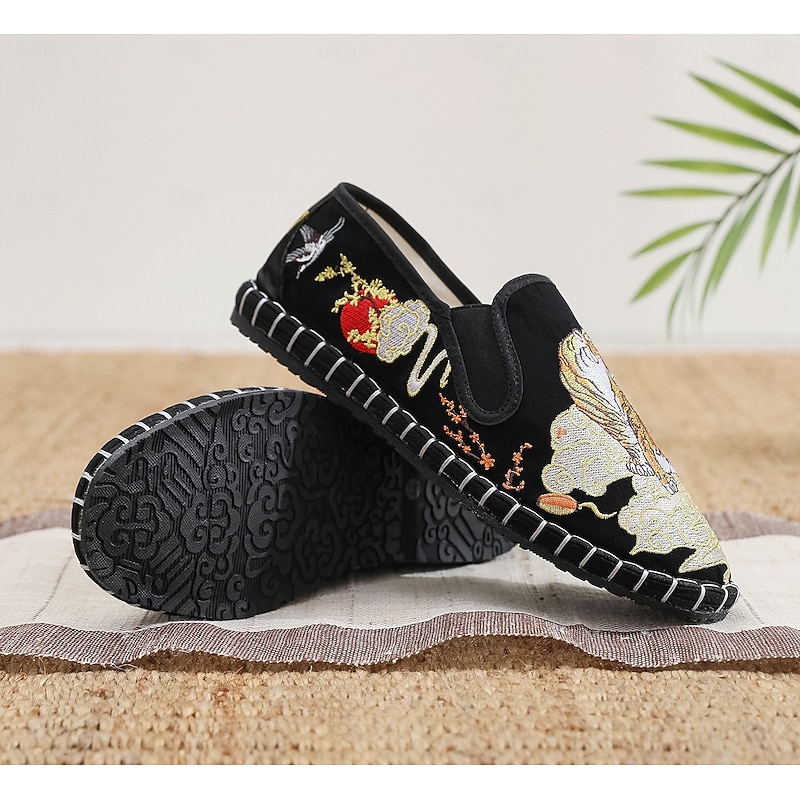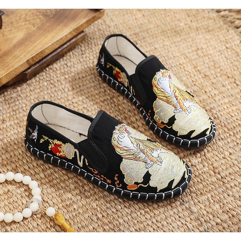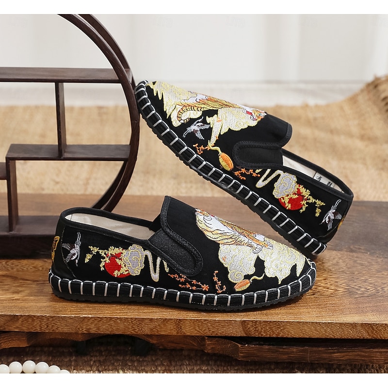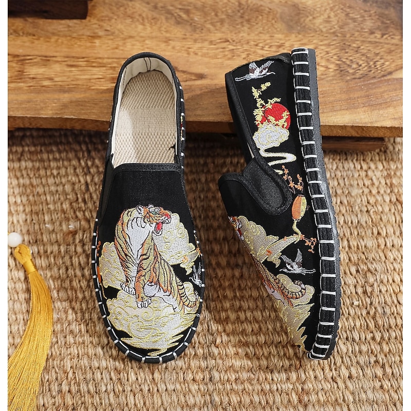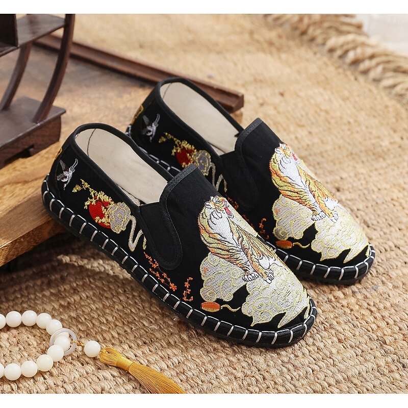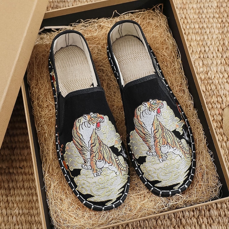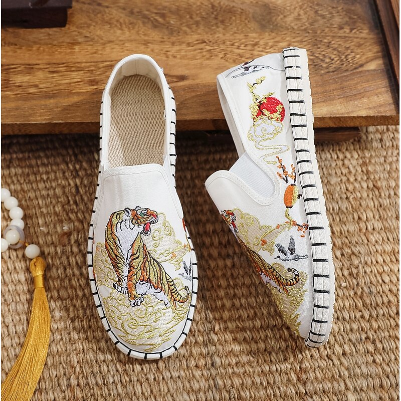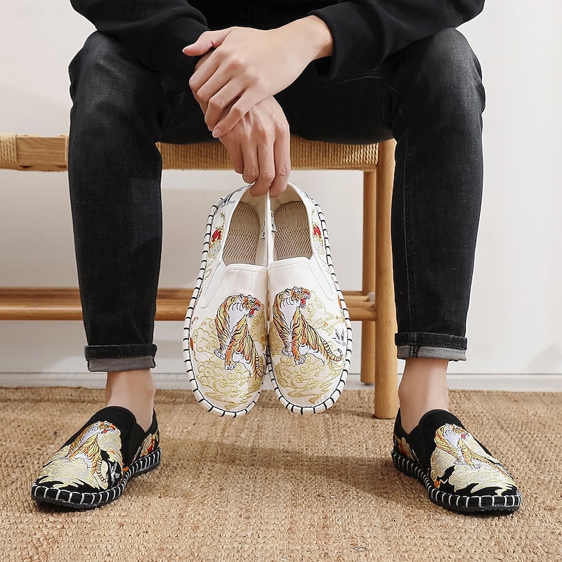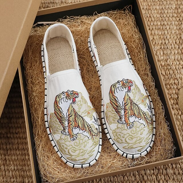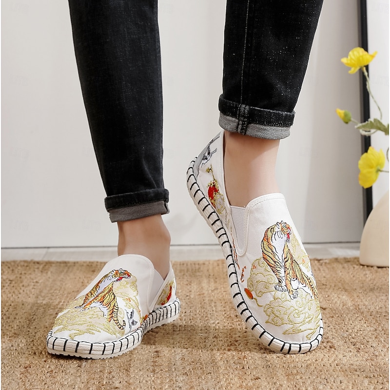 HOT ! Men's White Espadrille Slip-On Shoes with Artistic Embroidery - Stylish Footwear with Unique Tiger Design