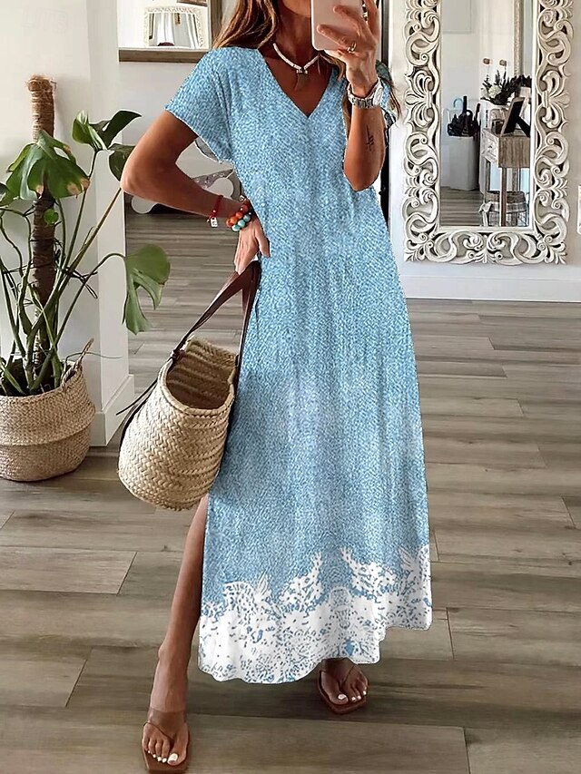 More information about Women's Maxi Dress Casual Dress Sundress A Line Dress Elegant Vacation Casual Holiday Beach Regular Fit Ombre Floral Graphic Short Sleeve V Neck Light Green Sky Blue Summer Spring