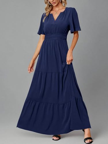 Amegoya Women's Summer Boho Maxi Dresses Casual V Neck Short Sleeve A-line Empire Waist Long Flowy Beach Dress