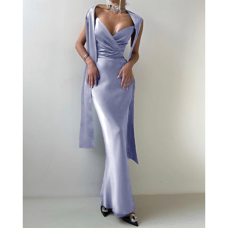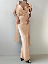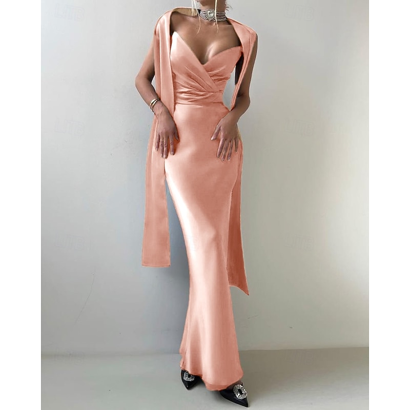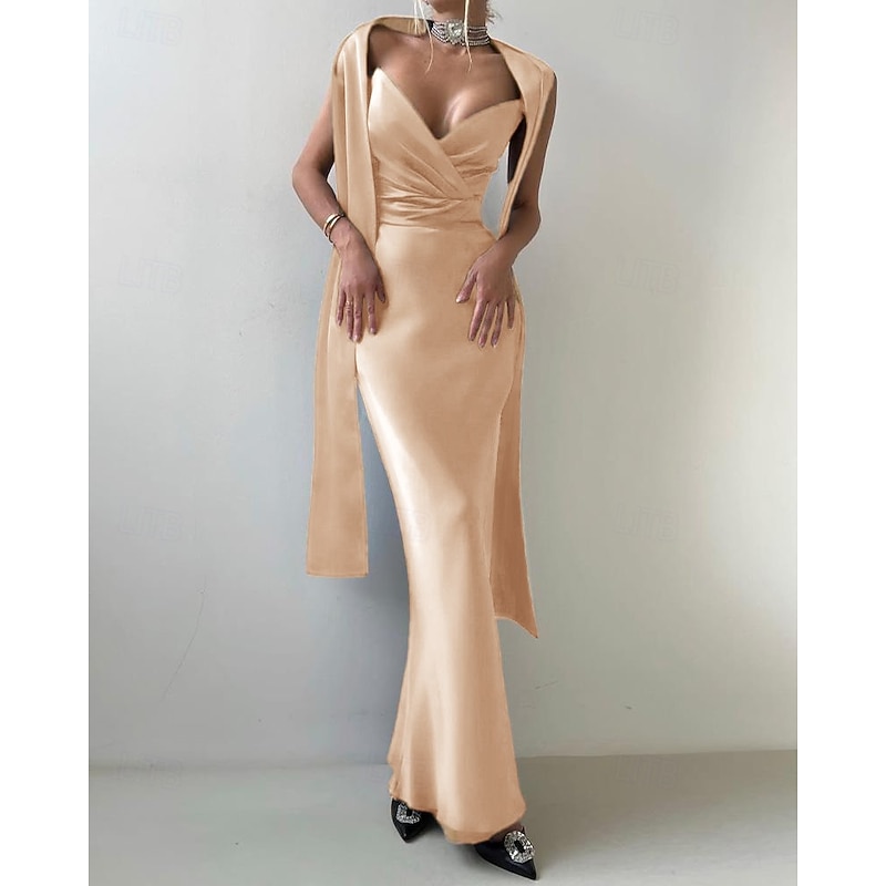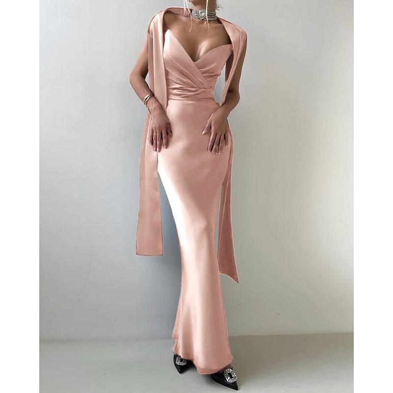 HOT ! 2-in-1 Dress Cape Dress Mermaid / Trumpet Evening Gown Elegant Dress Formal Semi Formal Dress Wedding Floor Length Sleeveless V Neck Satin Backless with Bow(s) Pleats Slit