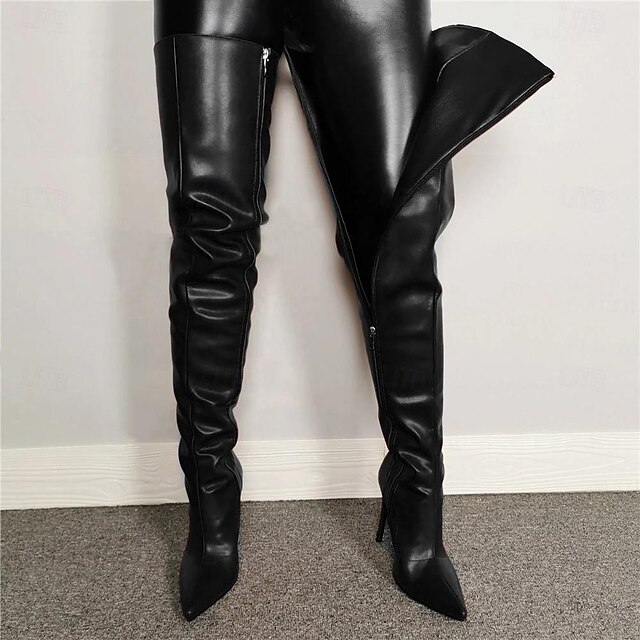 Women's Black Over-the-Knee Faux Leather Boots - Sexy Pointed Toe Stiletto Heels for Night Out 13
