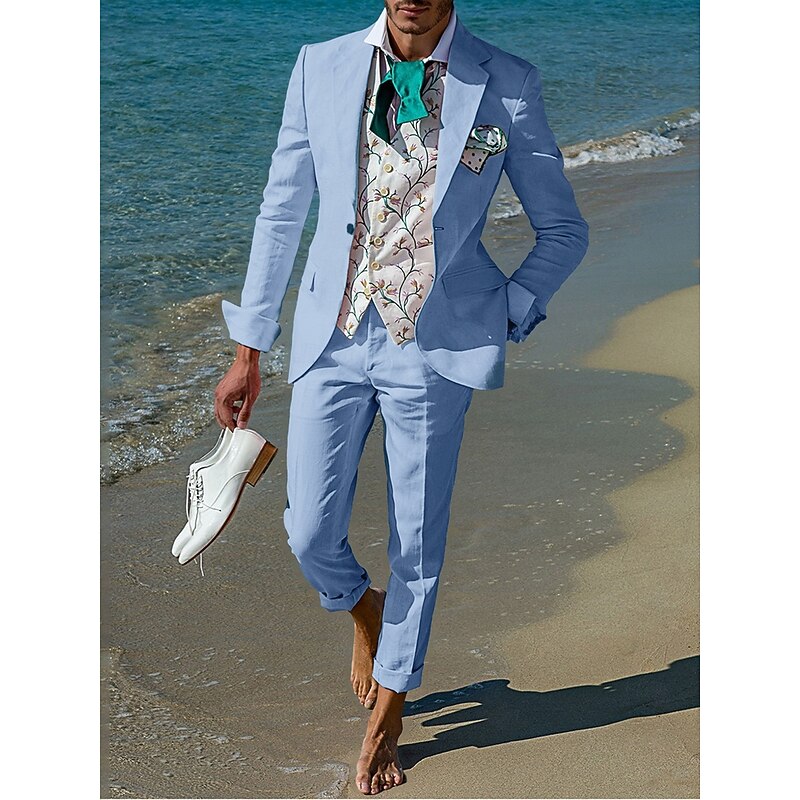 HOT ! Men's Beach Wedding Linen Suits Notch Lapel Pink Sky Blue Casual Street Style Solid Colored Standard Fit 2 Piece Single Breasted One-button