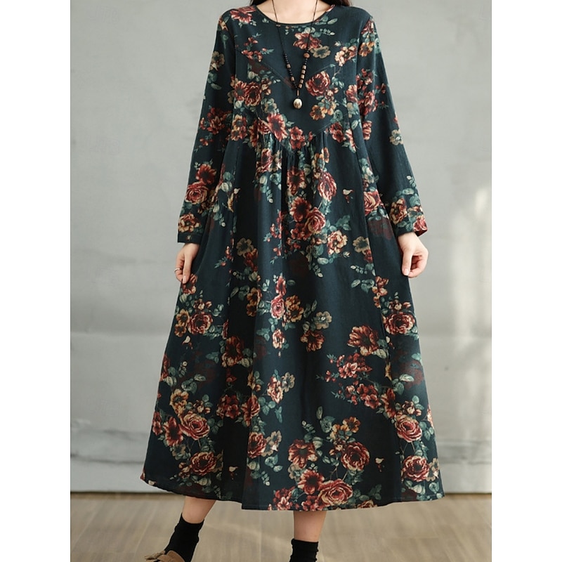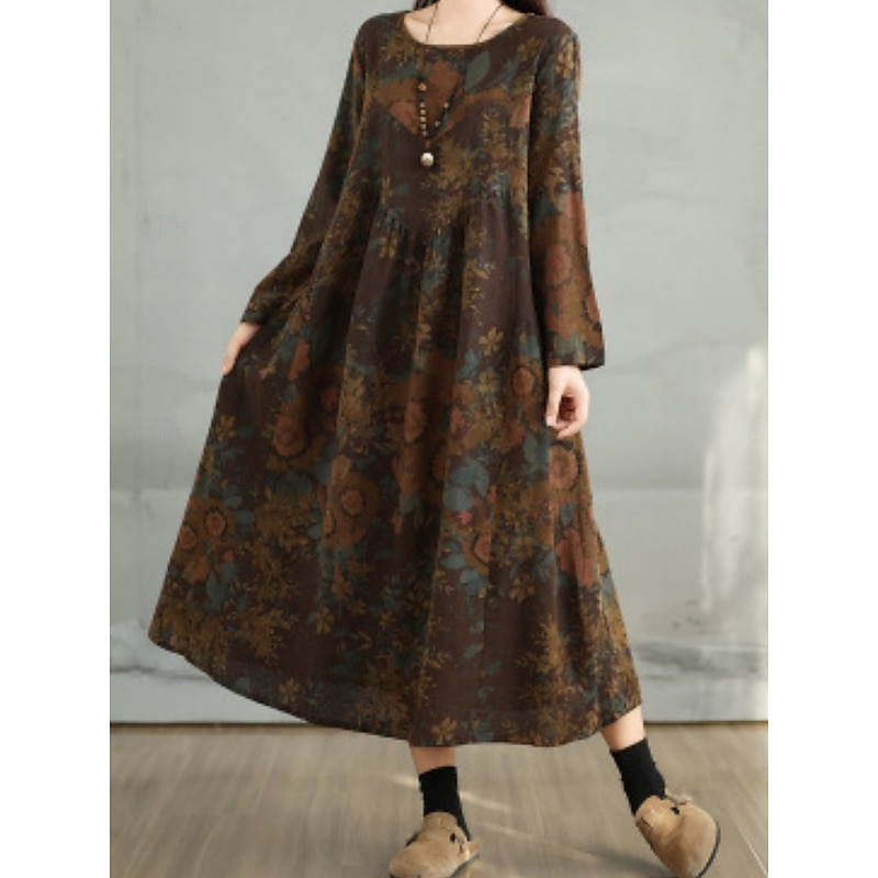 HOT ! Women's Maxi Dress A Line Dress Casual Daily Regular Fit Floral Long Sleeve Crew Neck Navy Red Dark Green Brown Summer Fall