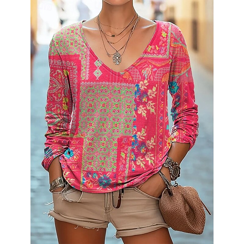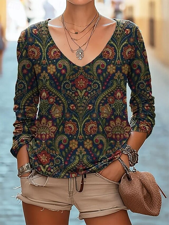 More information about Women's Blouse Floral Bohemia Daily Long Sleeve V Neck Regular Tops Daily Holiday Print Black White Red Navy Blue Emerald Green Summer Spring Fall
