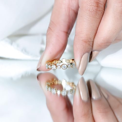 • Forever shine with the unmatched beauty of this Moissanite Eternity Band. A luxurious statement piece, shimmering round moissanites sparkles endlessly in bezel setting, making every day feel like a special occasion. Perfect for those who appreciate the finer things.