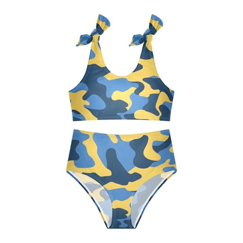 Girls' Bikini Set, Blue and Yellow Camouflage Pattern Kids Swimsuit 2 Pcs Beach Bathing Suit 2