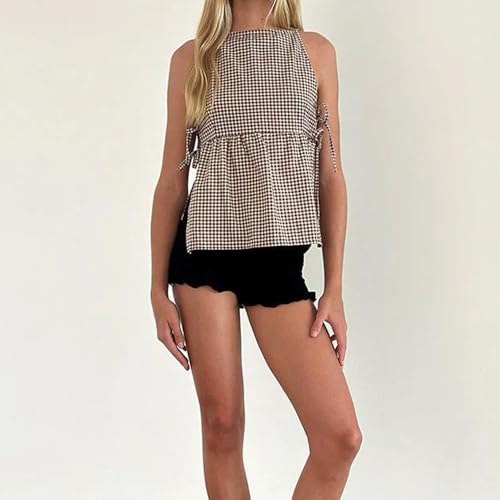 Women Y2K Gingham Tank Top Coquette Spaghetti Strap Side Tie-up Peplum Camisole Summer Going Out Top Streetwear