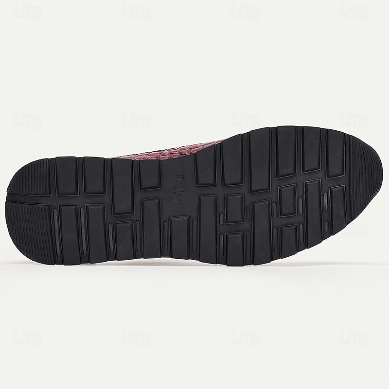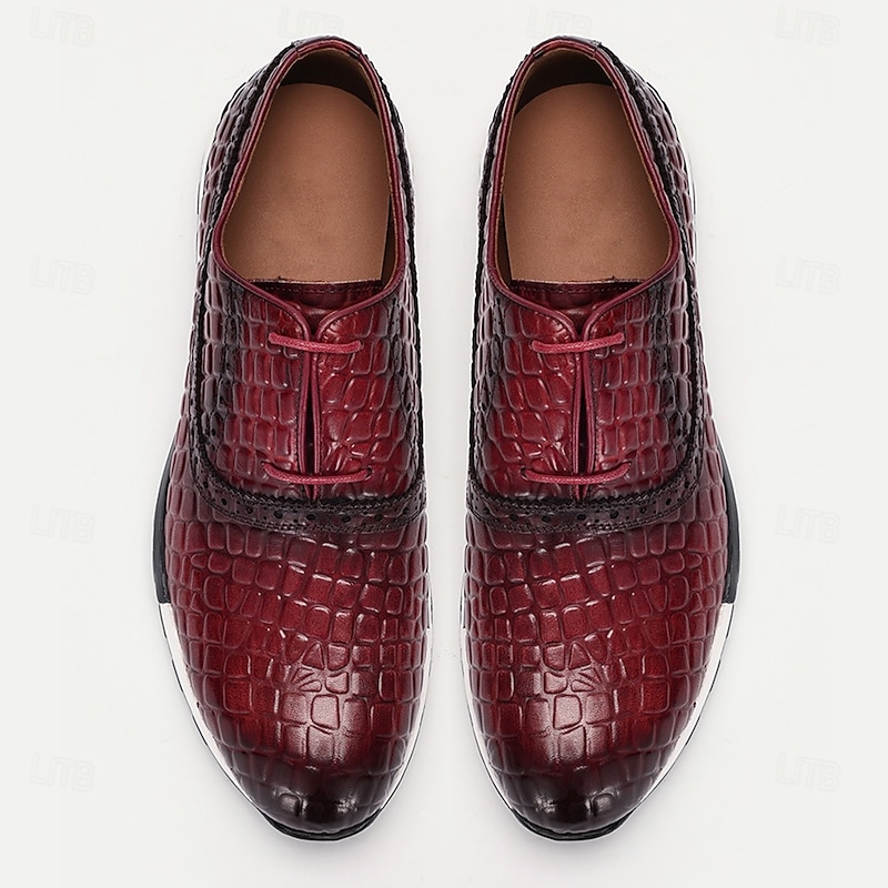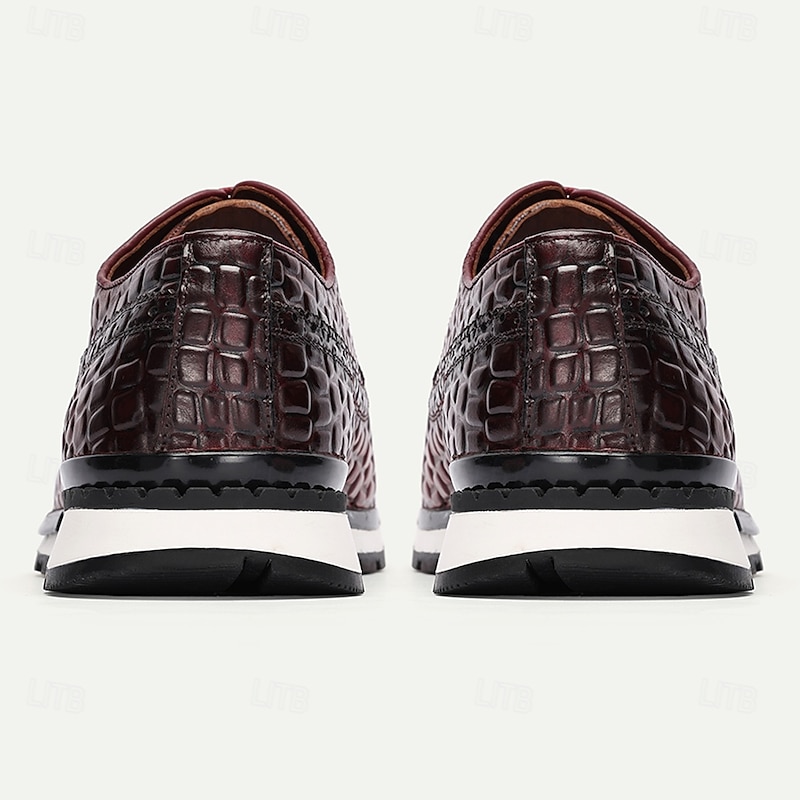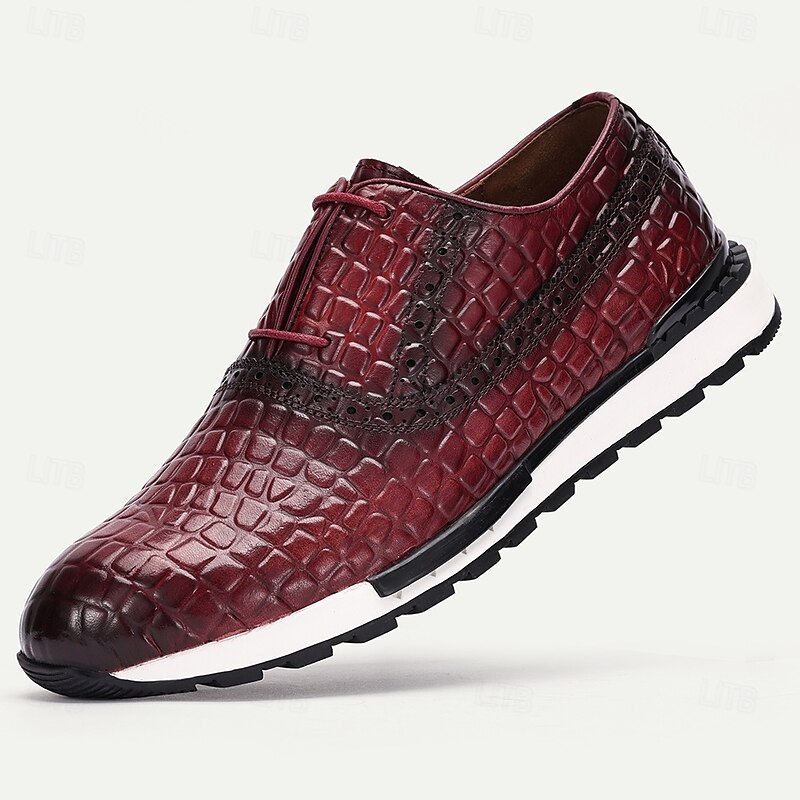 Highlights [Fabric] : Crafted from 100% Italian full-grain cowhide leather, these men's sneakers boast a luxurious crocodile pattern, providing an upscale look with high durability. The supple cowhide lining ensures comfort and breathability, perfect for all-day wear. [Fit] : These sneakers feature a round toe design, offering ample space and comfort for the toes. The silhouette is a modern take on the traditional brogue style, offering sleek and stylish lines that adapt seamlessly to both casual and semi-formal looks. [Design Highlights] : The embossed crocodile pattern on the cowhide leather adds a touch of sophistication and uniqueness. A classic lace-up closure ensures a secure fit while maintaining a timeless aesthetic. Perforated detailing enhances the design with an element of flair, and the sole is crafted in a contrasting black and white color scheme for visual appeal. [Occasions] : These sneakers are versatile enough for various settings, making them an ideal choice for both casual outings and dressier occasions. Whether you're headed to a weekend brunch or a semi-formal gathering, these shoes elevate any ensemble with their stylish and sporty charm. [Size Range] : Available in a wide range of sizes from US6 / EU39 / UK5 to US13 / EU46 / UK12, ensuring a fit for various foot sizes. The rubber outsole is slip-resistant, providing excellent grip and wear resistance, making them suitable for everyday activities.