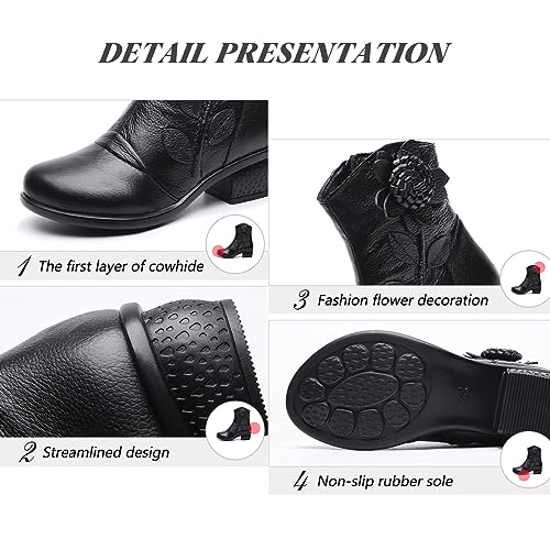 Women's Leather Mid Calf Half Boots Ethnic Floral Round Toe Block Low Heel Ankle Booties with Side Zipper 5