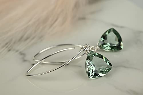 • Handmade sterling silver earrings, 10mm AAA Trillion cut green amethyst quartz dangle from silver sterling silver marquise earring wire. Earrings measure 1.625 x .5 inches.