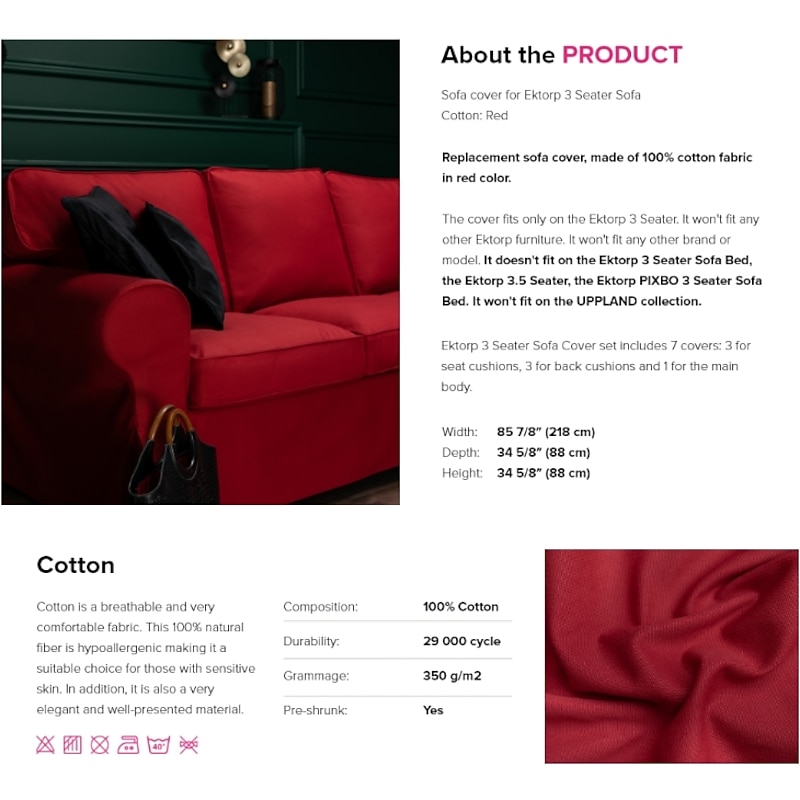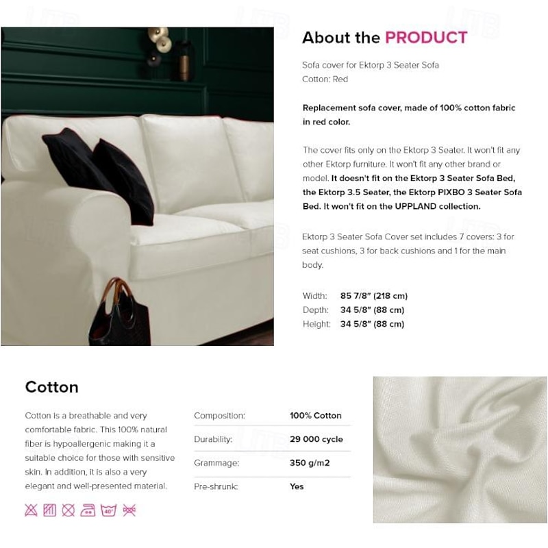 More information about 3 Seater Sofa Cover, Cotton Couch Cover with 3 Cushion Cover and 3 Backrest Cover For Ektorp Slipcover Washable Furniture Protector LITB PRIME cover Ektcover
