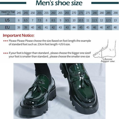 Sole material: RubberOuter material: LeatherClosure type: Pull-OnWater resistance level: Water ResistantHigh-Quality Material: Made Of Top-Grade Black Soft Patent Leather, It Is Finely Polished To Show A Deep And Shiny Texture, Adding An Irresistible Luxury Charm To Men. This Loafer Uses A Non-Slip And Wear-Resistant Rubber Sole. This Sole Design Has Excellent Grip And Wear Resistance, Ensuring The Safety Of The Wearer Even When Walking On Wet Or Uneven Roads.Thick Heel Platform Design: The exclusive Combination Of Thick Heel And Platform Design Not Only Provides The Wearer With A Good Height-Enhancing Effect, But Also Ensures Stability And Comfort When Walking. This Design Effectively Disperses The Pressure On The Feet, And Even If You Stand Or Walk For A Long Time, You Can Maintain A Relaxed State, Making Every Step A Pleasure.Fashion Tassel Decoration: On The Basis Of Classic Loafers, Fashionable Tassel Elements Are Incorporated, Adding A Touch Of Agility And Vitality To The Shoes. The Tassels Sway Gently With The Steps, Showing The Wearer's Unique Personality And Taste. This Design Not Only Breaks The Dullness Of Traditional Loafers, But Also Makes The Overall Look More Fashionable.Fashionable Item: Whether This Loafer Is Paired With A Suit And Leather Shoes To Attend A Formal Meeting, Or Paired With Casual Attire To Enjoy The Weekend, It Can Perfectly Blend In And Show Different Styles. This Versatile Feature Makes It An Indispensable Fashion Item In Men's Shoe Cabinets.Sizing TipοΌThe Shoe Size Chart Is Located On The Product Page, Please Check The Size Chart To Choose The Right Size. Perfect for everyday use. excellent materials and excellent craftsmanship ensure long-lasting durability.
