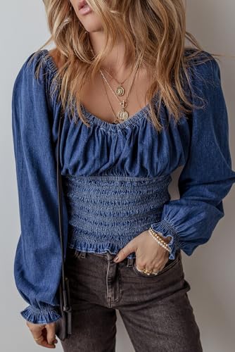 • ① 《Effortless Elegance》: Elevate your everyday style with this stunning denim blouse featuring a smocked design, ruffled puff sleeves, and a chic V-neckline.