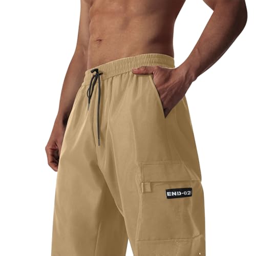 Pockets Cargo Pants for Men Solid Color Drawstring Elastic Workwear Pants Classic Lightweight Long Trousers Basic 6