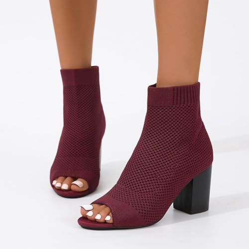 HOT ! SACFOF Peep Toe Booties for Women Knit Pointed Toe Chunky Block Heels Breathable Sandals Summer Casual Slip On Dress Sock Booties US5-11
