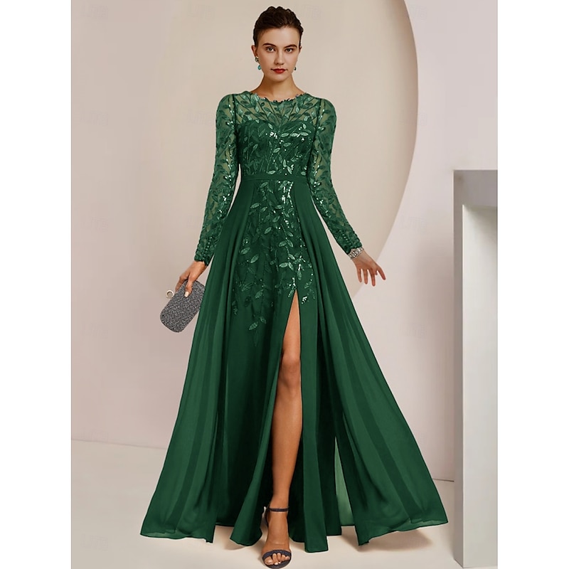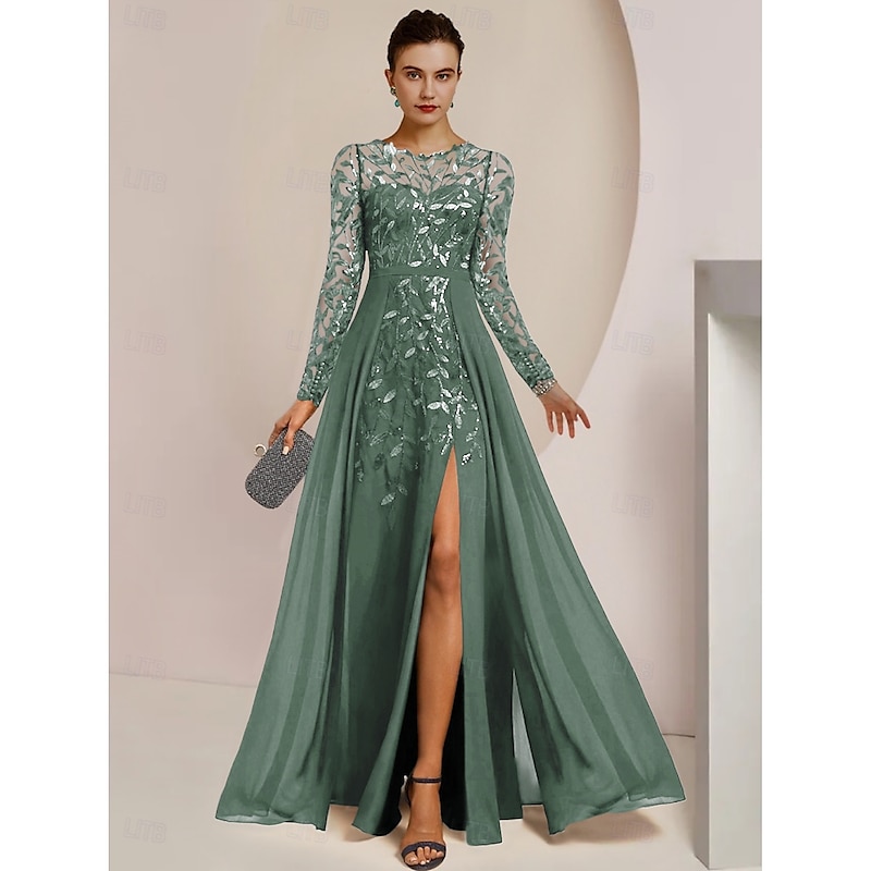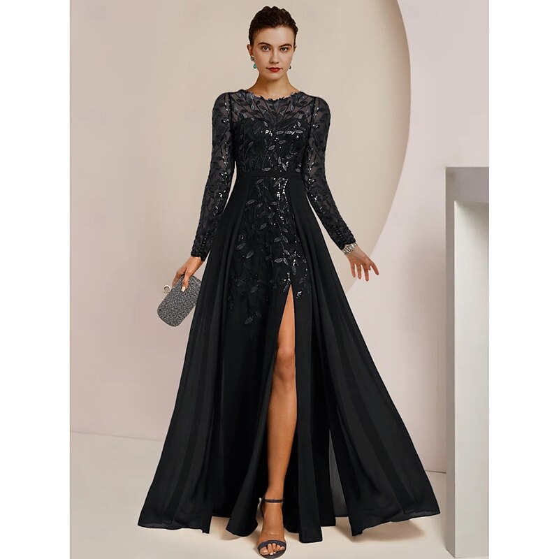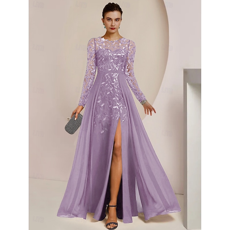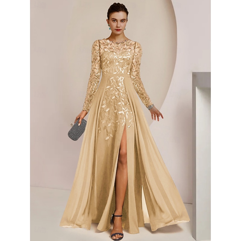 A-Line Mother of the Bride Dress Wedding Guest Elegant Jewel Neck Floor Length Chiffon Lace Sequined Long Sleeve with Split Front Ruching Solid Color 1