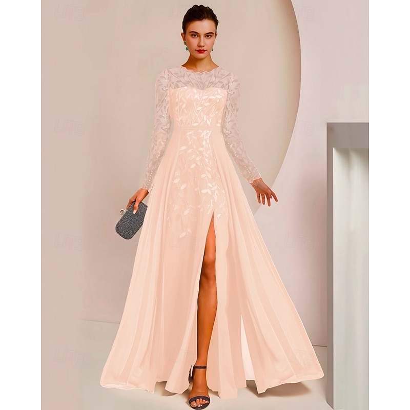 More information about A-Line Mother of the Bride Dress Wedding Guest Elegant Jewel Neck Floor Length Chiffon Lace Sequined Long Sleeve with Split Front Ruching Solid Color