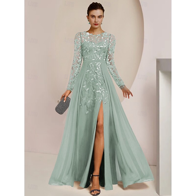 A-Line Mother of the Bride Dress Wedding Guest Elegant Jewel Neck Floor Length Chiffon Lace Sequined Long Sleeve with Split Front Ruching Solid Color 6