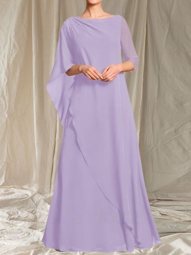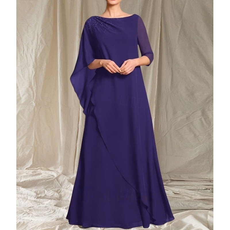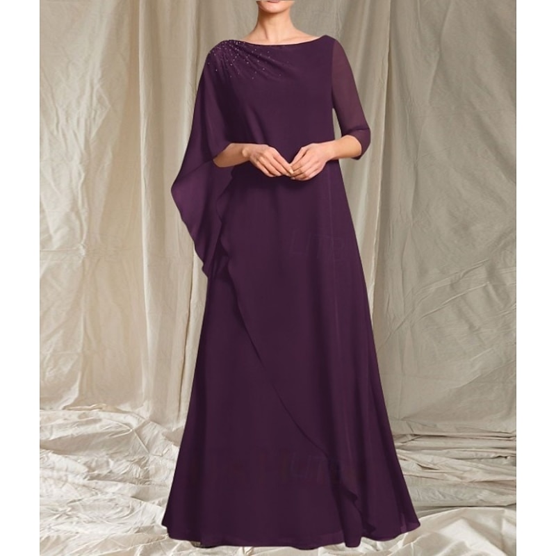 More information about A-Line Mother of the Bride Dress Wedding Guest Elegant Crew Neck Floor Length Chiffon 3/4 Length Sleeve with Beading