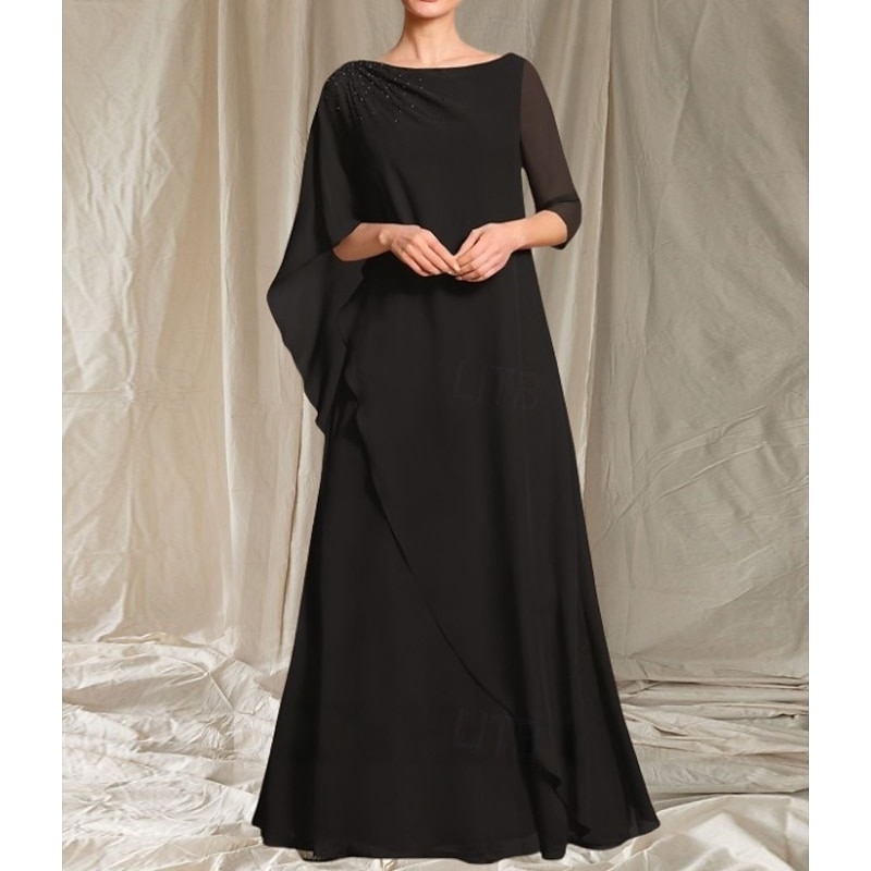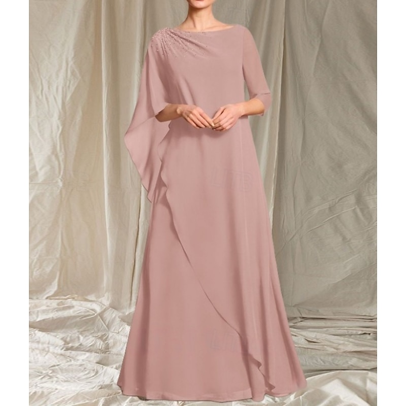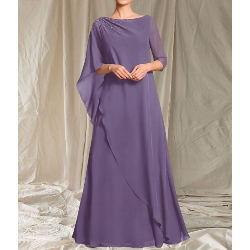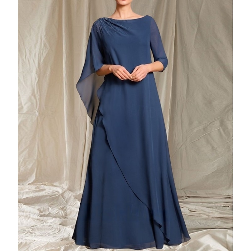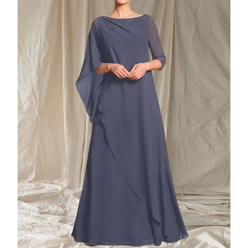 HOT ! A-Line Mother of the Bride Dress Wedding Guest Elegant Crew Neck Floor Length Chiffon 3/4 Length Sleeve with Beading