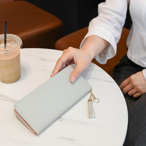 HOT ! Women's Long Wallet with Zipper - Stylish Cross Texture Leather Purse with Tassel, Multi-Card Holder & Coin Pocket (Gray)
