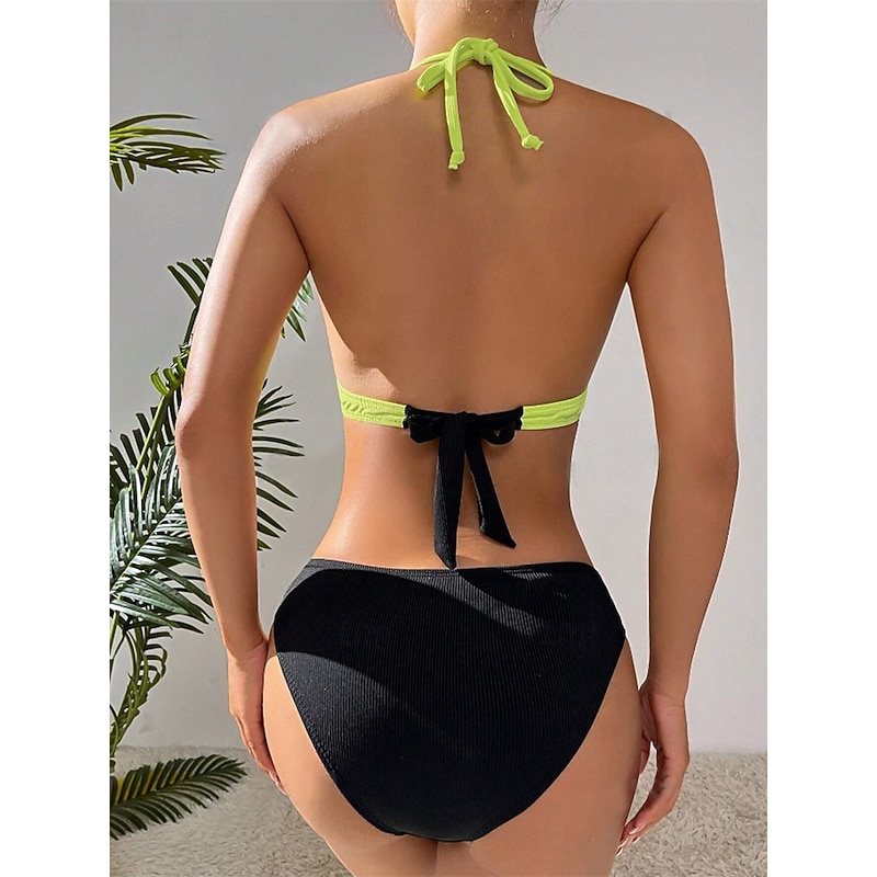 More information about Women's Swimwear Bikini 2 Piece Swimsuit Tummy Control High Waist Slim Vacation Beach Wear Solid Color Striped Plunge Sleeveless Bathing Suits