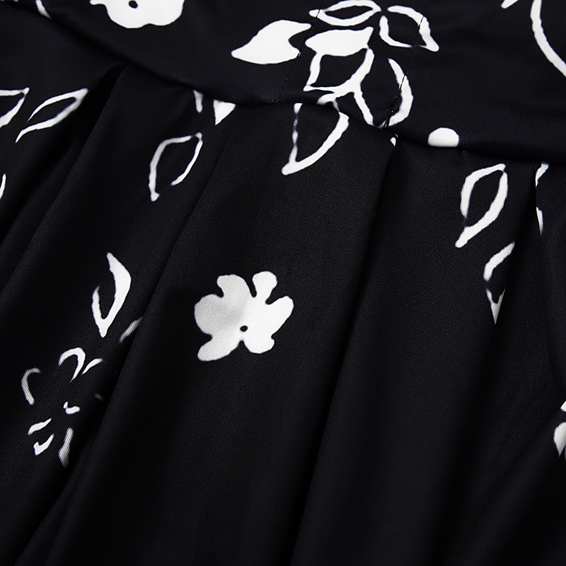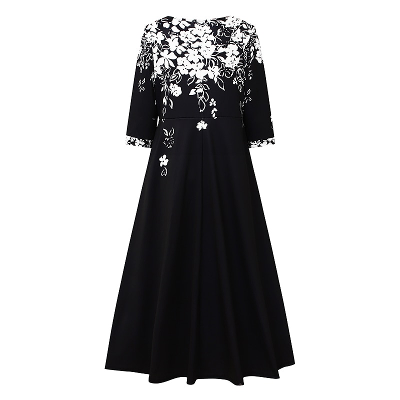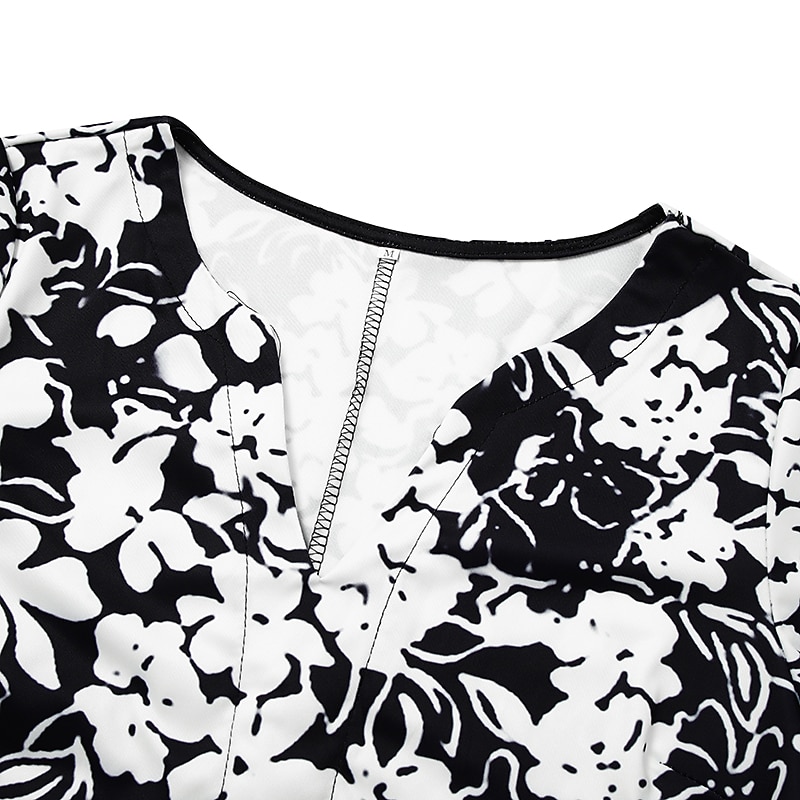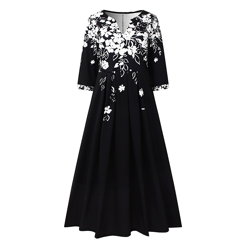 Highlights [Fabric:] Crafted from high-quality polyester, this tunic dress provides a lightweight and breathable feel, ensuring comfort and ease of movement throughout the day. Its micro-elasticity offers a flexible fit suitable for various activities. [Silhouette:] The A-line silhouette of this dress is designed to flatter all body types, offering a stylish regular fit that emphasizes comfort and elegance. This versatile shape makes it a perfect addition to any wardrobe. [Design Highlights:] Featuring a sophisticated V-neckline, this dress merges modern style with classic elegance. The black and white floral print enhances its feminine charm, while the convenient side pockets add a practical touch. The three-quarter sleeves provide an ideal balance of coverage and style, perfect for any occasion. [Occasions:] This tunic dress is ideal for daily wear and weekend outings, easily transitioning from casual to semi-formal occasions. Pair it with sandals for a relaxed look or heels for a more polished appearance, adapting effortlessly to your day's events. [Size Range:] Available in a variety of sizes, from S to 2XL, this dress ensures a great fit for a diverse range of body shapes and sizes.