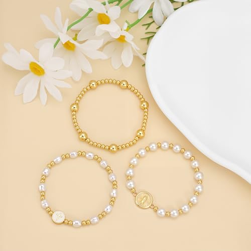 GolbalJew Gold Beaded Bracelets for Women Trendy Non Tarnish Stack Cross Pearl Bracelet Set 14K Gold Plated Catholic Rosary Bracelets Stackable Stretch Jewelry Gifts 3