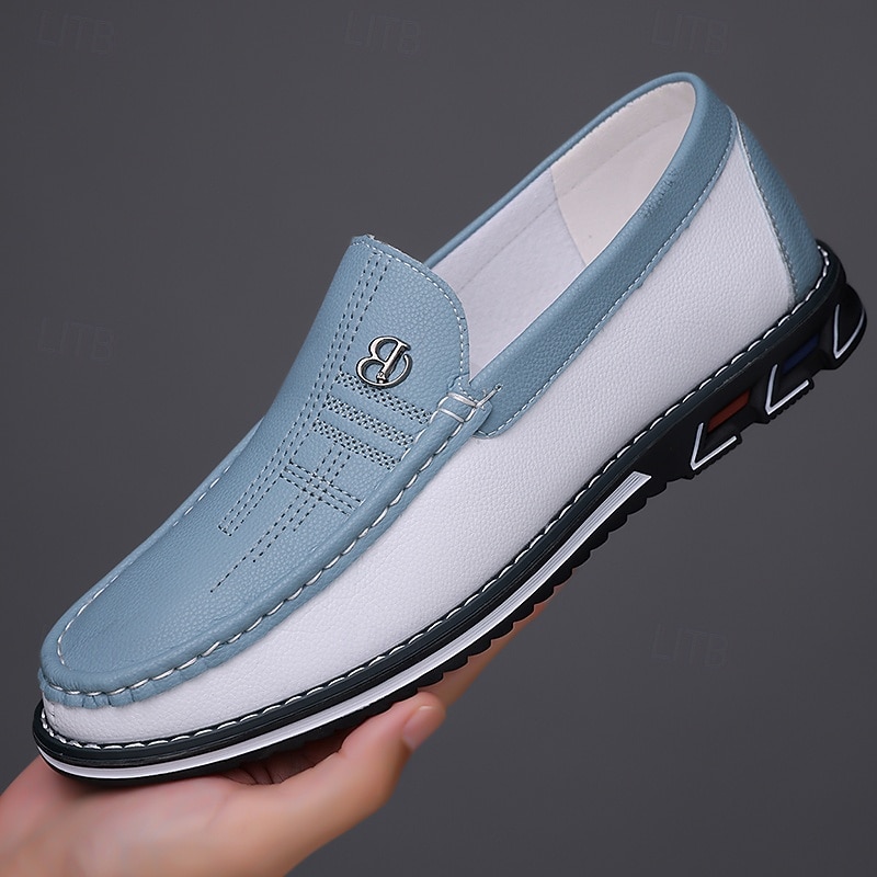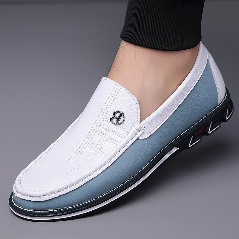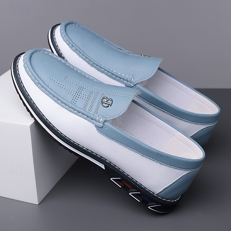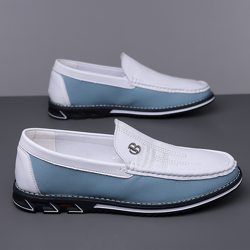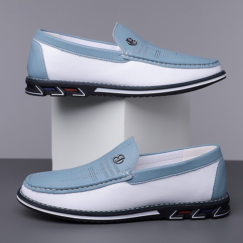 Highlights [Fabric and Material] : Crafted from high-quality PU leather, these men's loafers combine smooth and textured finishes for both durability and a polished appearance. The faux leather material ensures a sophisticated look and is well-suited for fall and winter seasons. [Fit and Style] : Designed as a slip-on, these loafers offer convenience and ease of wear. The round toe shape and secure fit make them comfortable for all-day wear, allowing for natural foot movement while maintaining a stylish silhouette. [Design Highlights] : Featuring a two-tone color scheme with a light blue and white or blue leather-like exterior, these loafers stand out for their elegance and modern flair. The addition of a subtle metal embellishment on the upper part of the shoe enhances its classic yet contemporary design. A refined stitching detail along the edges adds a touch of sophistication, while the black outsole provides stable grip and slip resistance. [Occasions] : These loafers are perfect for both casual and semi-formal occasions, effortlessly blending classic elements with modern styling. Ideal for daily wear, they complement various outfits, making them suitable for work, weekend outings, and social gatherings. [Size Range] : Available in a wide range of sizes from US7.5 to US12, these loafers cater to different foot sizes, ensuring a comfortable fit for a variety of wearers.