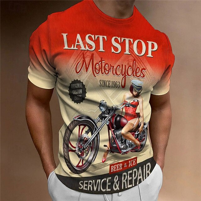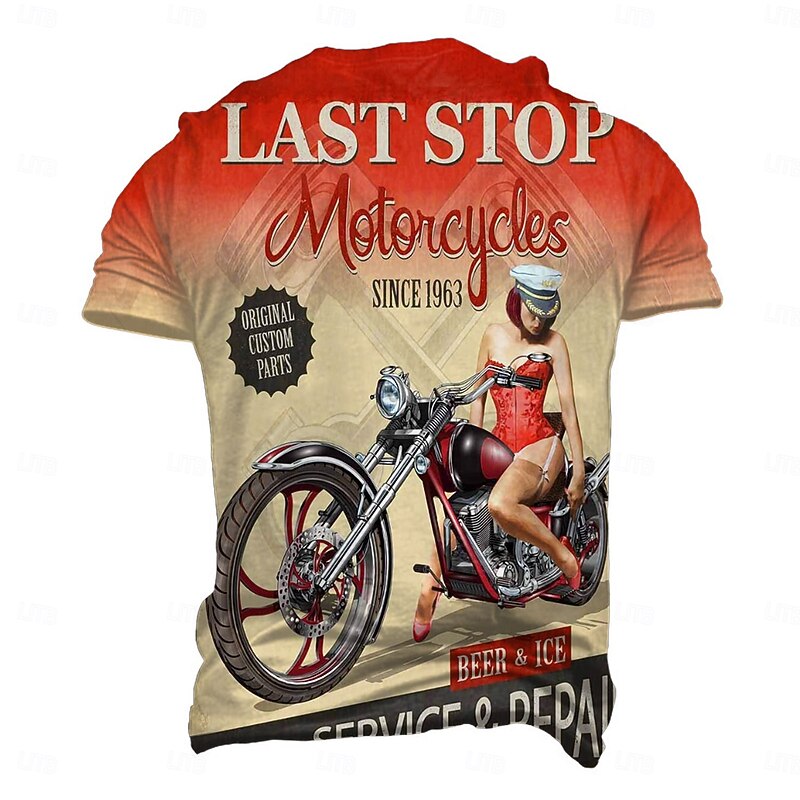 Highlights [Fabric:] Crafted from a high-quality polyester blend, this men’s T-shirt offers a comfortable, breathable fit that’s perfect for spring and summer wear. The micro-elastic fabric ensures ease of movement, making it a practical choice for everyday activities. [Fit:] Designed with a regular fit, this T-shirt provides a relaxed and comfortable silhouette. The short sleeves offer casual comfort, ideal for daily wear or outdoor adventures. [Design Highlights:] Featuring a bold graphic design, this T-shirt pays homage to vintage motorcycle culture. The "Last Stop Motorcycles Since 1963" text, combined with a detailed illustration of a custom motorcycle and accompanying pin-up style figure, accentuates its classic, retro charm. The ombre color effect from deep orange-red to light cream adds an eye-catching dimension. [Occasions:] Perfect for daily, sports, and outdoor activities, this T-shirt suits a variety of casual settings. Whether you're a motorcycle enthusiast or simply appreciate retro styling, this shirt adds a stylish edge to any casual wardrobe. [Size Range:] Available in a wide range of sizes, from S to 3XL, to accommodate a diverse array of body types and fashion preferences.