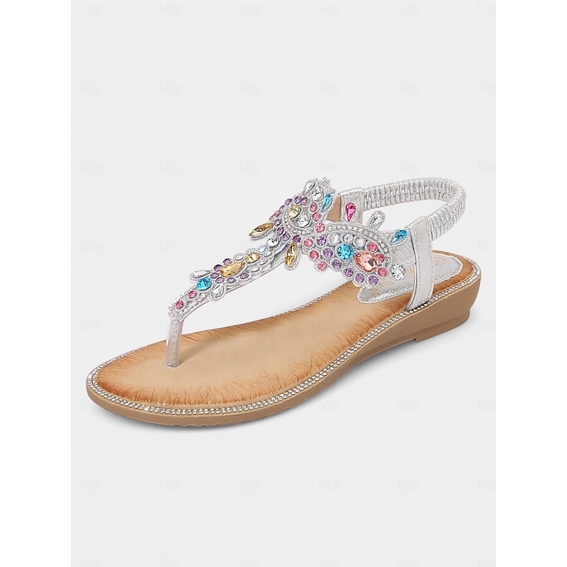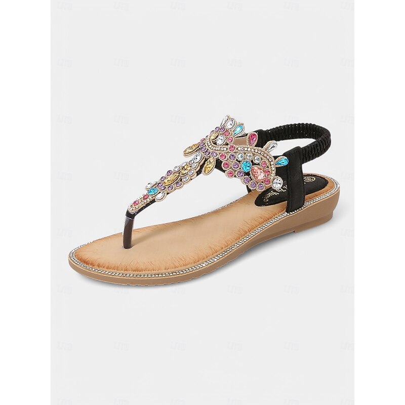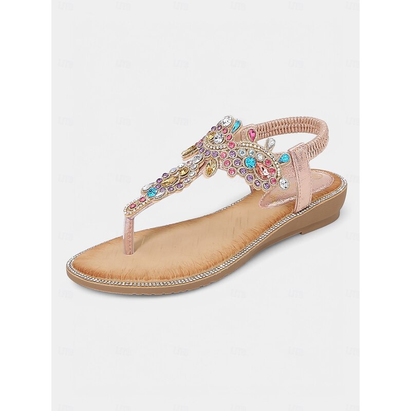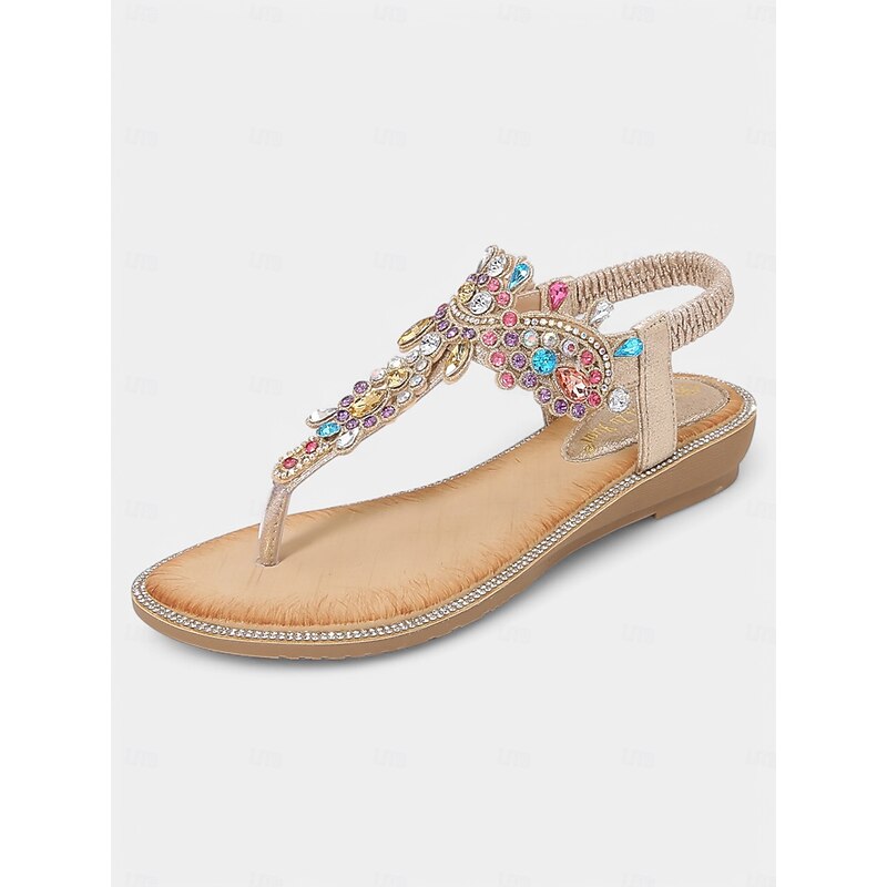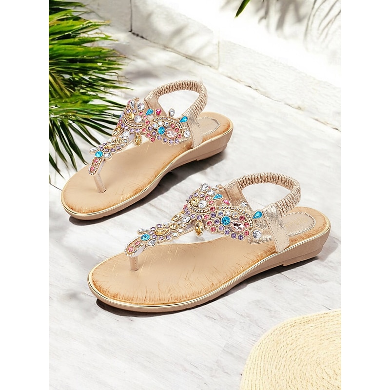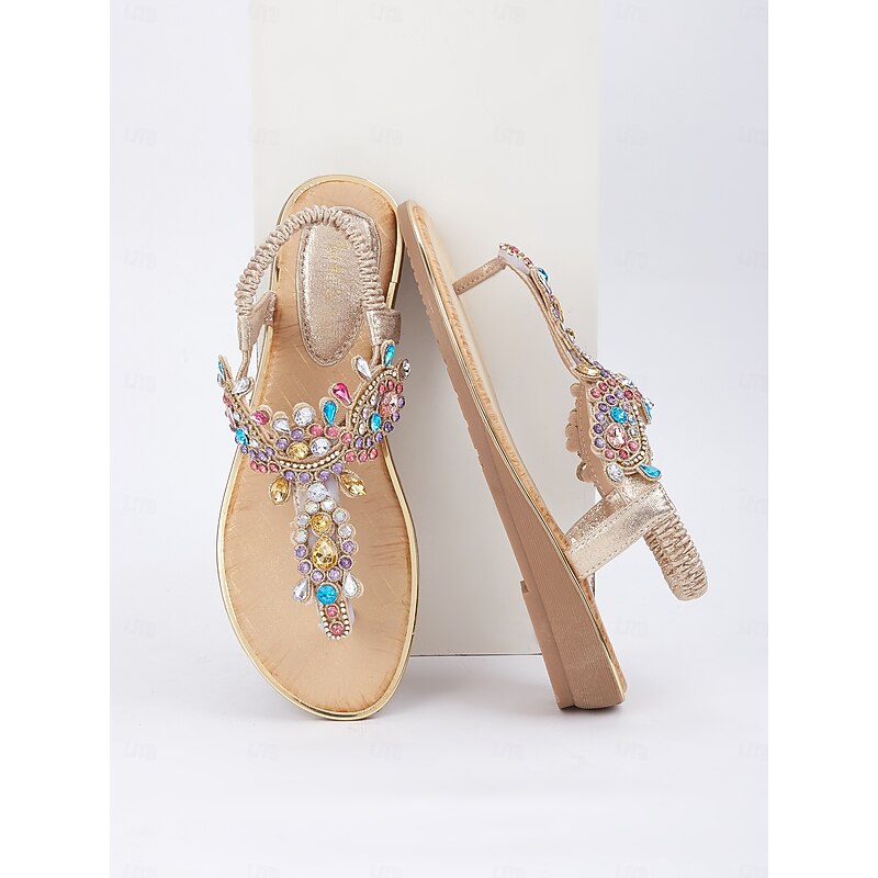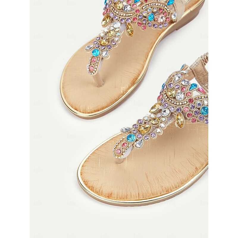 HOT ! Women's Gold Rhinestone Flat Sandals – Elegant Bohemian T-Strap Sandals for Summer, Beach Vacations, and Casual Outings