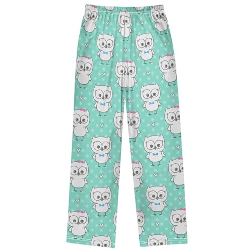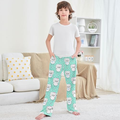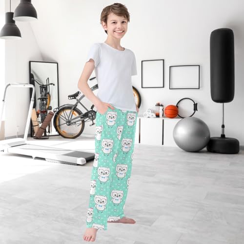 Boy's Pj Pants White Little Owl Bow Green Heart Lounge Bottoms Elastic Waist Kids Joggers with Pockets Size 6-14 6