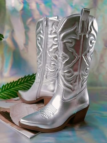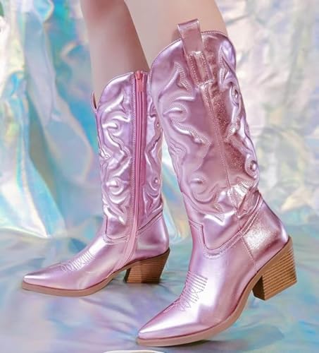 Cowboy Boots for Women - Mid Calf Cowgirl Western Style Pull-On Pointy Toe Lightweight Breathable Leather Retro Comfort Wear Walking Shoes Non Slip Heel with Arch Support 4