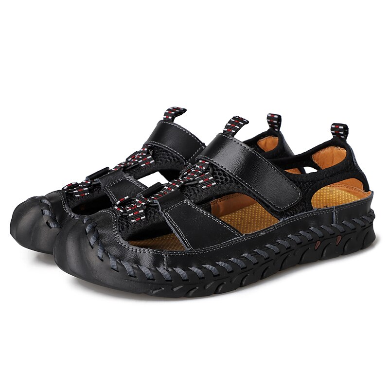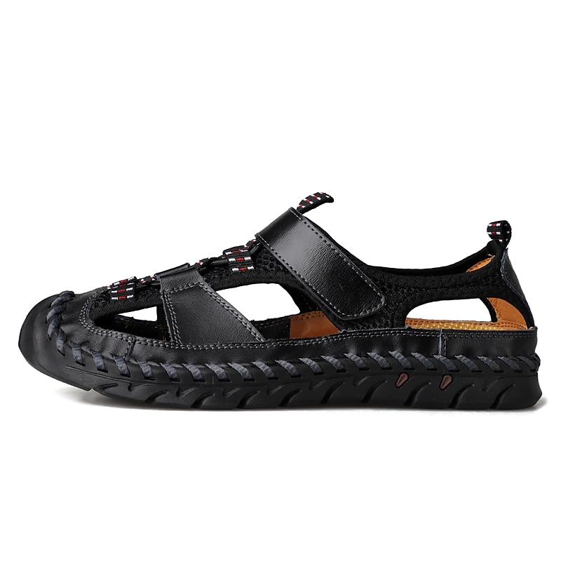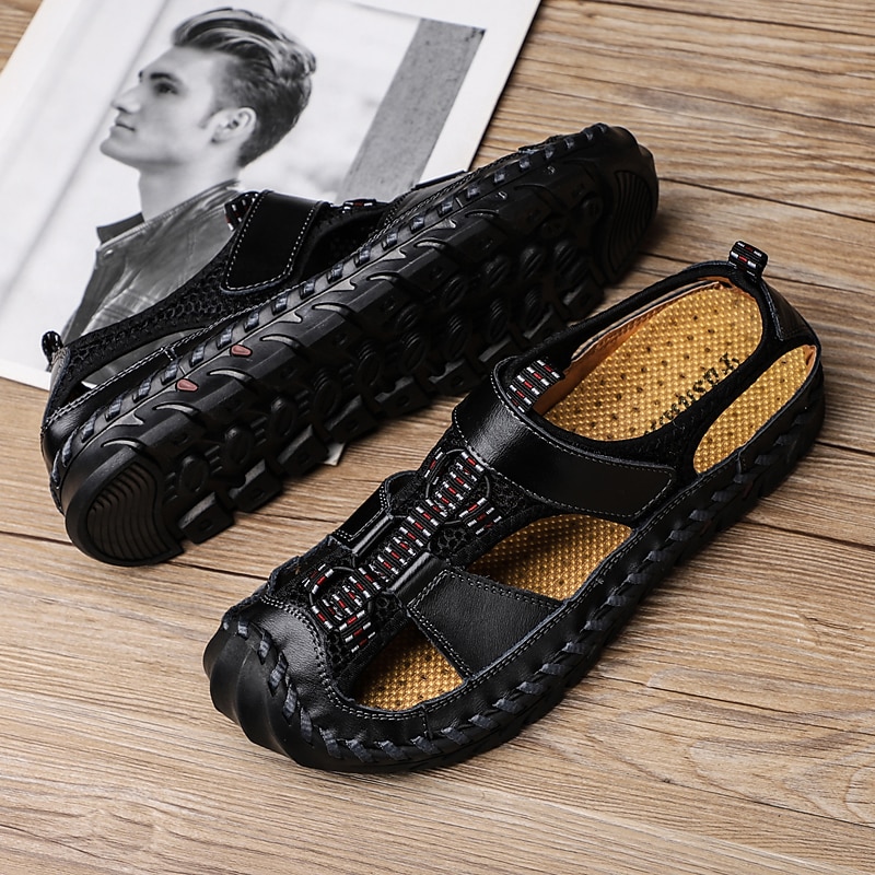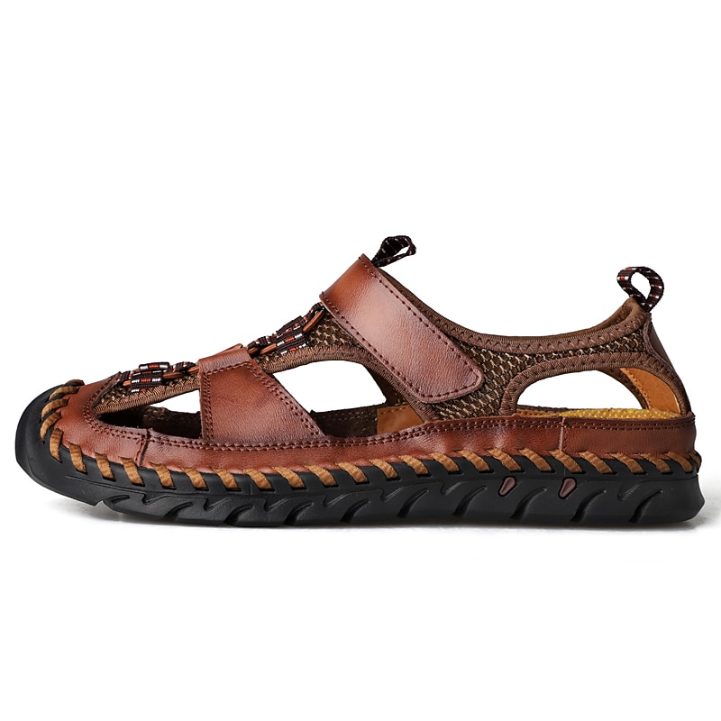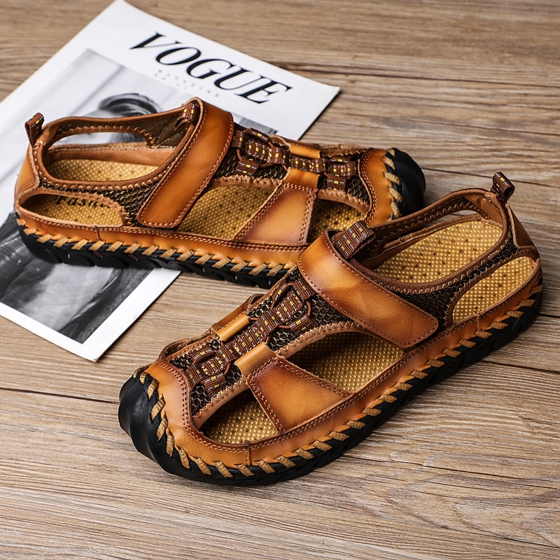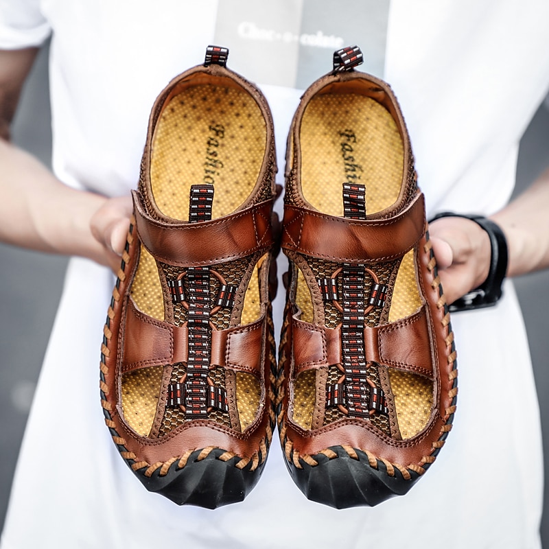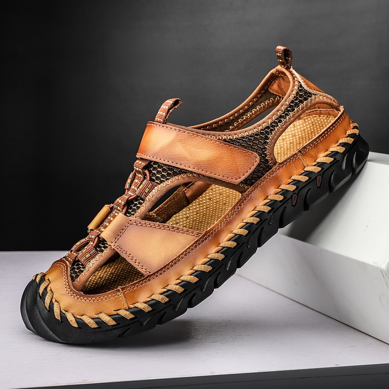Men's Closed-Toe Leather Sandals with Hand-Stitched Details, Breathable Mesh Design – Ideal for Outdoor and Casual Wear