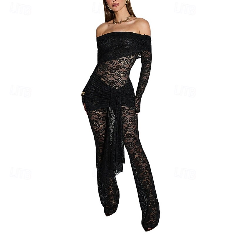 Women's Normal Jumpsuit Stylish Solid Color Long Sleeve Off Shoulder Lace Going out Bar Regular Fit Black Summer 2