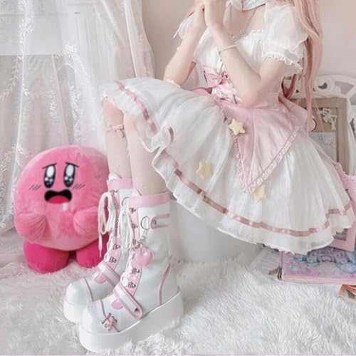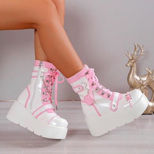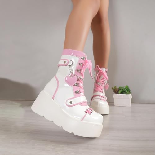 SACFOF Women's Combat Boots Lace Up Wedge Chunky Platform Ankle Booties Goth Punk Cute Heart Lace Up Rave Booties with Chain