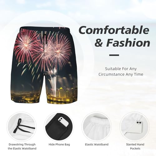 • MULTIPLE POCKETS FOR EFFICIENT STORAGE: fireworks pattern Store your essentials with ease with our men's swimming shorts that come equipped with two front side pockets and a hidden built-in pocket.