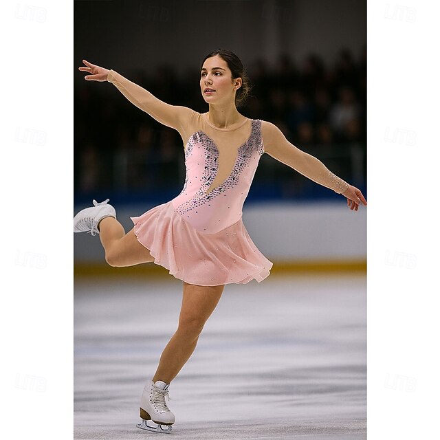 More information about Figure Skating Dress Women's Girls' Ice Skating Dress Pink Patchwork Thumbhole Mesh Spandex High Elasticity Training Competition Skating Wear Classic Crystal / Rhinestone Long Sleeve Ice Skating