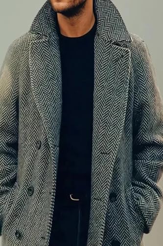 VENNYNG Men's Vintage Tweed Overcoat Belted Long Jacket Wide Herringbone Trench Coat Double Breasted Outwear Winter Autumn 2
