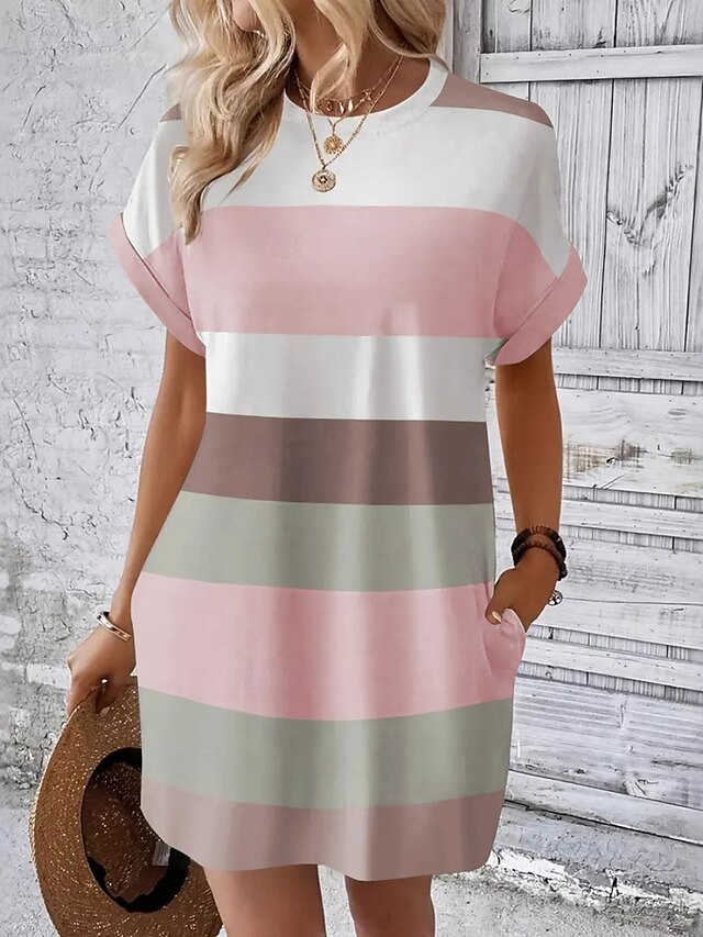 Women's Mini Dress T Shirt Dress Tee Dress Shift Dress Casual Outdoor Daily Holiday Regular Fit Stripe Short Sleeve Crew Neck Pink Sky Blue Brown Green Summer 7