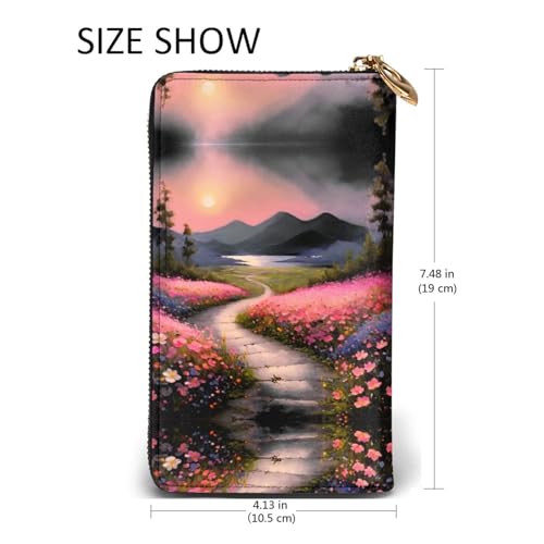 A path full of flowers printing Women's leather long handheld wallet large capacity credit card zipper bag 1