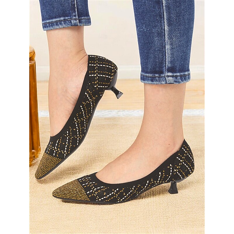 Highlights [Fabric] : Crafted from high-quality Tissage Volant with synthetic leather lining, these elegant flats blend breathable knit fabric with luxurious gold thread detailing for a comfortable and flexible fit throughout the seasons. [Shape] : Featuring a classic pointed toe design, these flats exemplify a sophisticated and modern aesthetic. The kitten heel provides an elegant lift, perfect for enhancing your silhouette with comfort. [Design Highlights] : The shoes are adorned with subtle gold threading on the upper, along with rhinestone embellishments that add a distinct touch of luxury. The slip-on loafer closure ensures easy wear and adds to the sleek, fashionable style. [Occasions] : Versatile in nature, these black and gold-tone kitten heels are ideal for a myriad of occasions, from daily office wear to evening outings, providing unparalleled comfort and style for both casual and formal events. [Size] : Available in a variety of standard sizes from US5.5 to US10.5, ensuring a perfect fit for a wide range of wearers. Simply choose your usual size for optimal comfort and style.