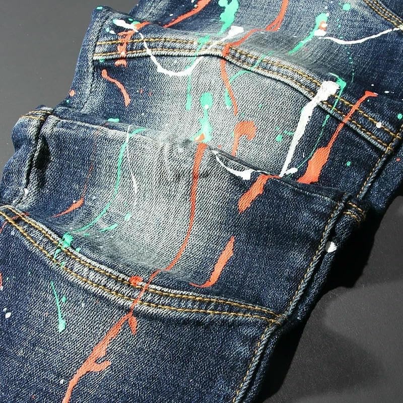 More information about Streetwear Men Jeans Retro Elastic Slim Fit Ripped Biker Jeans Trousers Painted Hip Hop Denim Pants Mens