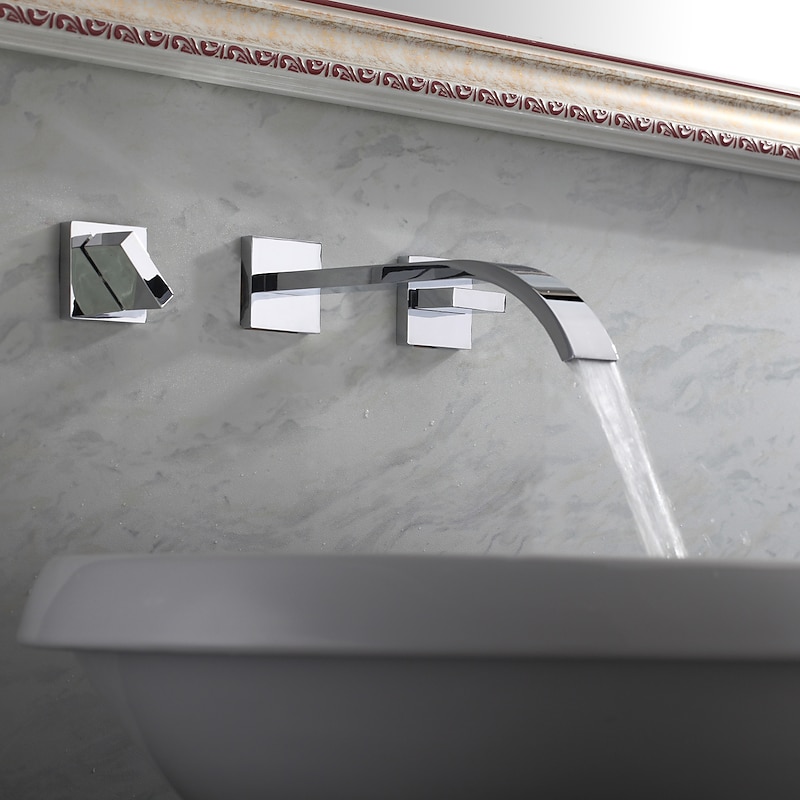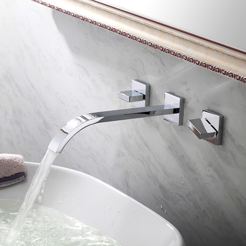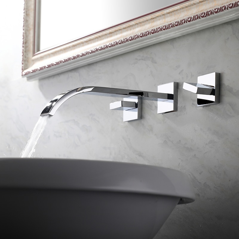 Wall Mounted Bathroom Sink FaucetSilvery Widespread Chrome Two Handles Three Holes Bath Taps with Hot and Cold Water 1