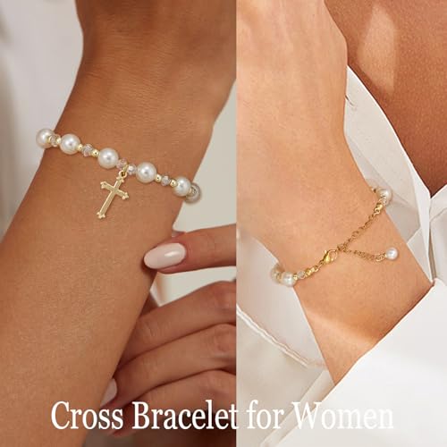 • Rosary Beaded Faith Jewelry: 8mm faux pearls, 3mm gold beads, and clear crystal are strung by hand to give you a distinctive cross bracelet,Featuring a timeless 14K gold plated polished stainless steels cross charm that dangles from the chain