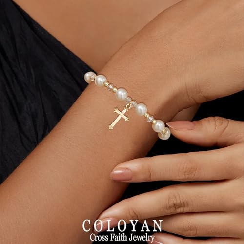 sought-after ! COLOYAN 9 PCS Cross Pearl Rosary Bracelet for Women, Cross Charm Pearl Crystal Beads Bracelet, Adjustable Handmade Rosary Faith Bracelet Jewelry