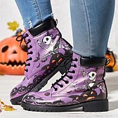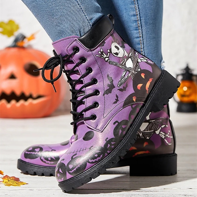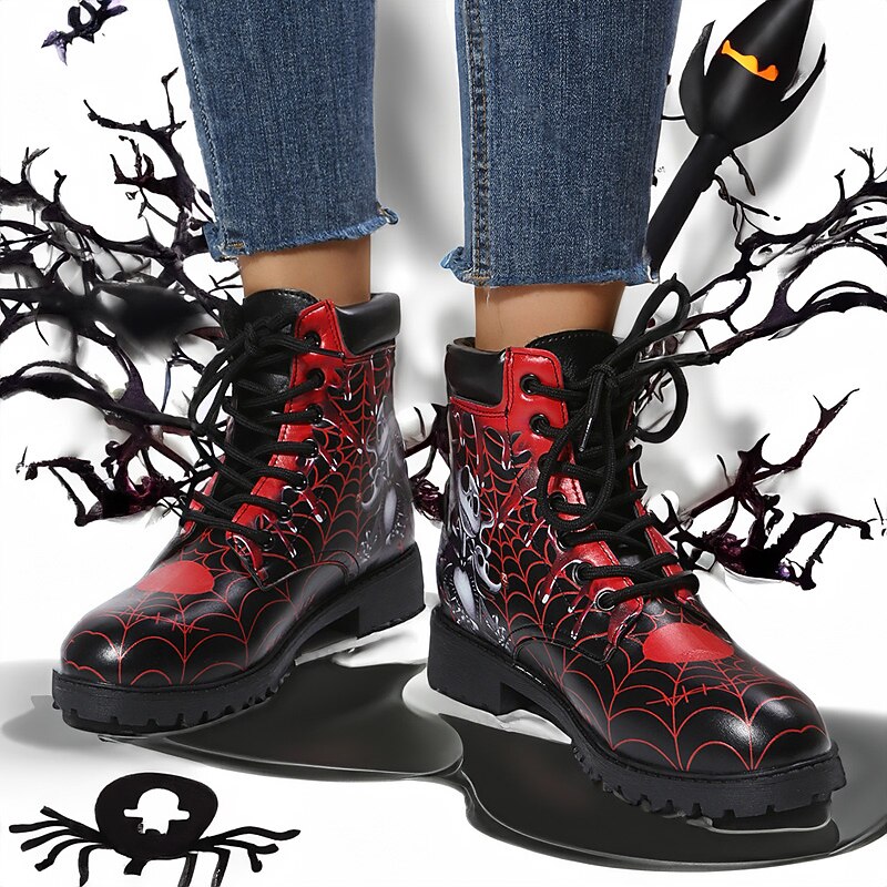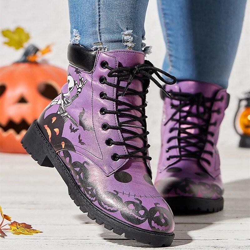 HOT ! Women's Halloween Skull Print Combat Boots - Gothic Style Lace-Up Ankle Boots for Spooky Season