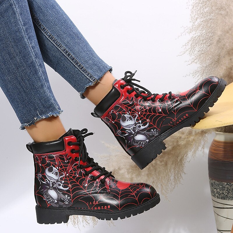 Women's Halloween Skull Print Combat Boots - Gothic Style Lace-Up Ankle Boots for Spooky Season 1